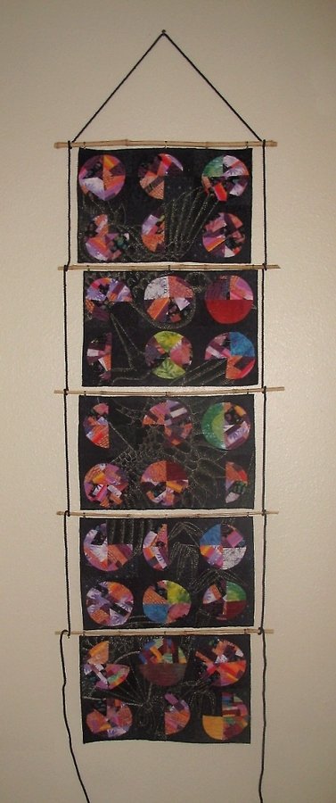 brenn1 Asian Moons - Totally original design started in a Sue Benner class at Quilting Adventures in New Braunfals, Texas. It is fused, cut apart, shuffled then refused. After cutting the circles apart, I added some hand painted fabrics. Thread painted in gold on the black background (also assembled w/ different black fabrics) are designs from real kimonos. Cranes, fans and bamboo are very typical designs on kimonos. The shapes on the moons themselves are the cloud shapes used on kimonos. The reason there are 5 panels is that the Japanese do not do things in 4s. One of the words for "4" also means "death".