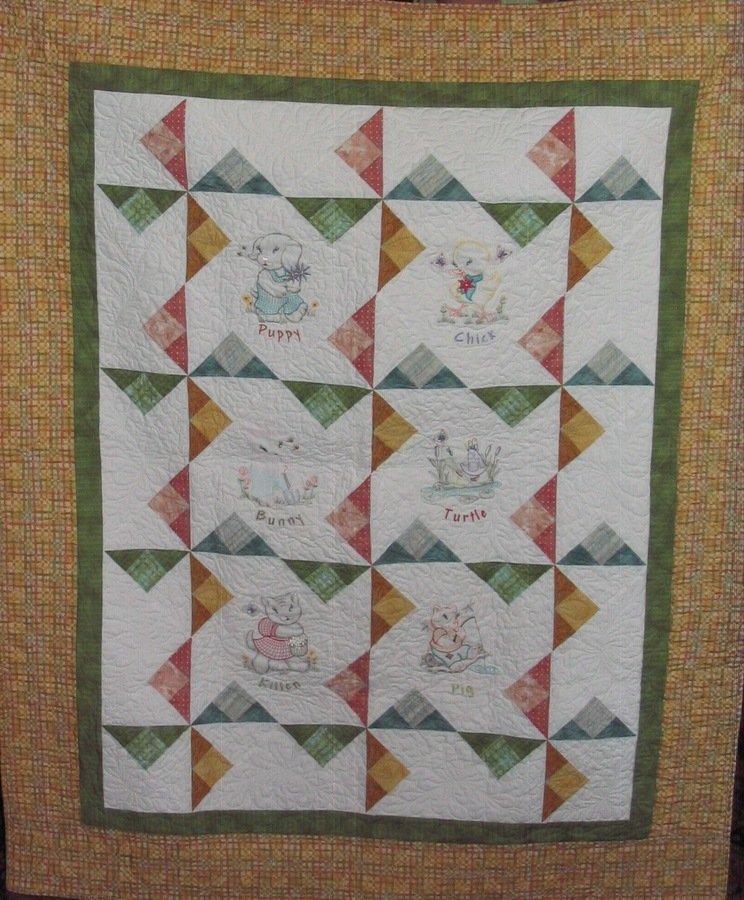 tweeter59 If It Looks Like A Duck.... - Baby quilt made from Embroidery Library designs and leftover patches from Eleanor Burn's Fabric Gal quilt. My husband noticed my "chick" was really a "duck"--thus the name. A close up of that block is in my other photos.