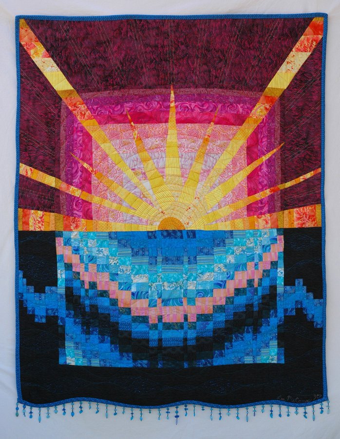 lea.mccomas Sunset - Inspired by a sunset off the coast of Antigua, I began this wallhanging using modified bargello piecing. It also includes metallic thread painting and quilting, along with some beading along the bottom and sprinkled throughout the water section.