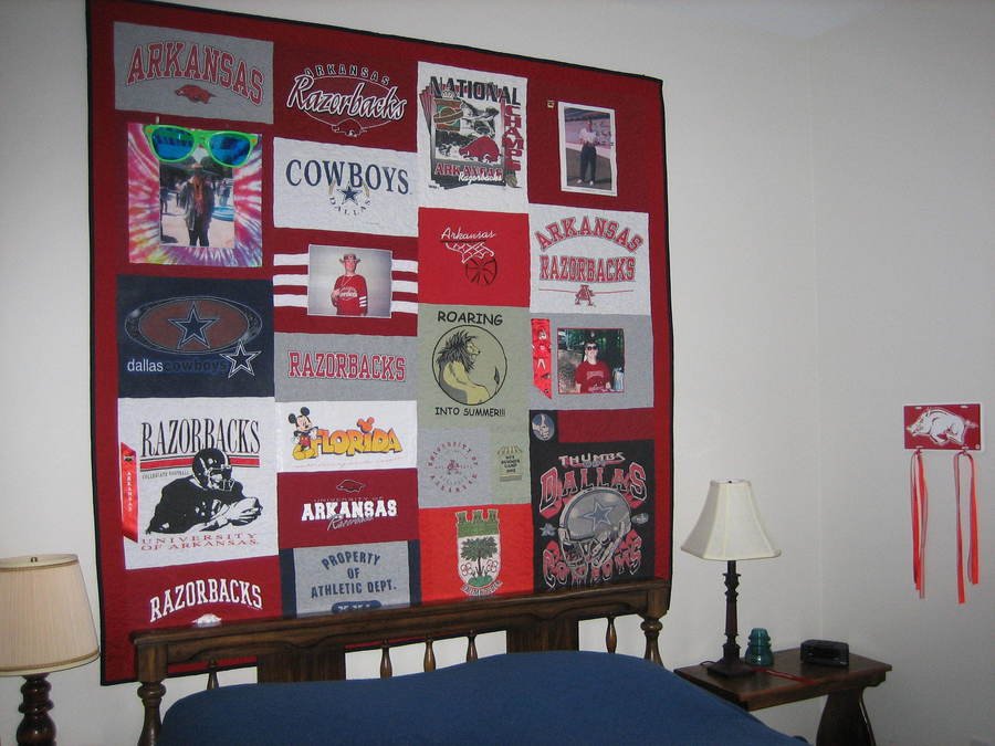 momoffour Brian's T-Shirt Quilt - Our mentally challenged son passed away in 2006 and this year I finally was able to take his old T-shirts and make a quilt. He loved football, especially the AR Razorbacks and Dallas Cowboys, so he had lots of shirts depicting those two teams. I scanned some photos of him and an autographed photo of the former Razorback coach and included them in the quilt which now hangs in his bedroom.