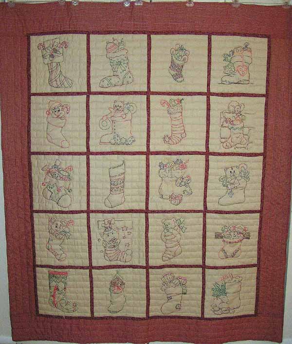 thorups Stockings Hung By The Chimney With Care - 20 embroidered blocks of filled Christmas Stockings. Hand quilted 'bricks' is background of each block. Border is machine quilted. Size: 61" X 73". Reversible. Images collected from free Internet coloring pages and clip art.