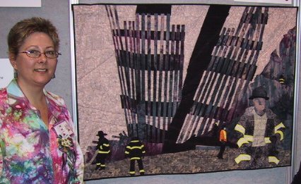 WEST1E Lingering Images - After 3 days of watching TV I couldn't do it any more. I needed to do something so I went to my sewing room. The images wouldn't leave me so I made this quilt of the image I couldn't forget. It was finished in one week. Shortly after that there was a call for Sept 11 quilts to be in a special showing in Houston. I sent mine and had it auctioned to help support the familys. It is published by C&T Publishing by Karey Bresenhan titled; America:From the Heart on page 29