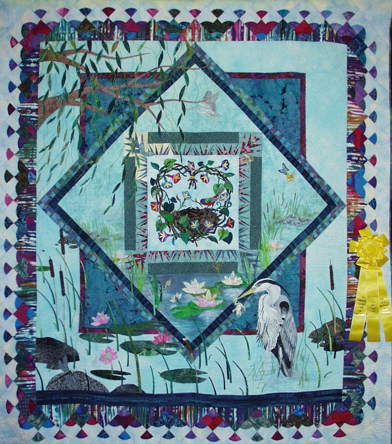 WEST1E Believe - This is a Round Robin (RR) quilt. I needle turned the center block which is a Jeanna Kimball pattern. All the rest of the quilt is of original design. There were 6 of us in the RR. We won 3rd place at the MN quilt show and from that Quilters Newsletter asked us to send it to them for photography. Unfortunately, blocks from QNL the UPS truck caught fire and the quilt was badly burned. (see link) http://www.lostquilt.com/UPS_Fire.html