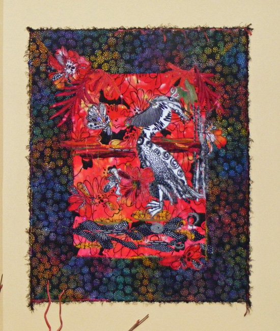 fiberwoman Pelican - Pelican based on art by friend, Beki Killorin (www.bekikillorin.com), who made the sketch of the bird for me. This was 6 years in the making, as I got frustrated and put it aside many times. My ideas were reluctant to come to fruition. It has 3D aspects, with the design of the flower (or sections of it, brought forward in butterflies, flowers, etc.