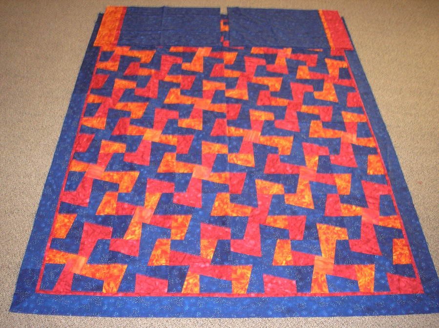 Altenbach Hot Wheels for Haley - This quilt was a PROCESS of taking a huge mistake and creating a quilt that actually worked. Thinking that I was cutting the background fabric strips the correct size I zipped through 15 strips before I realized I was cutting the background fabric the size of the twist or focus of the block! I ended up reversing the block into a positive/negative set and came up with this twist. My granddaughter has a limited color pallet that also gave me this challenge to complete something that I think she will like. The pillowcases are an added bonus and really set it all off. Whew!! I can't get her sister's quilt done before Christmas so it's going to have to be set aside.