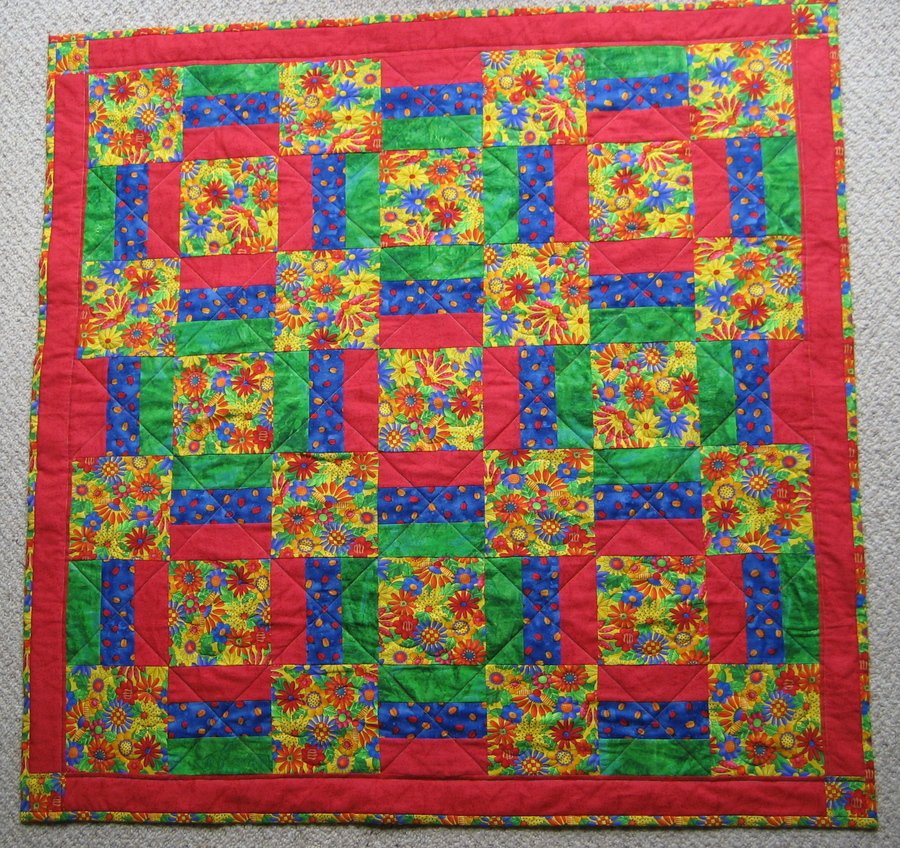 fabpatch Poppy's first quilt - sewn to show the bright flower print, fabrics chosen to co-ordinate