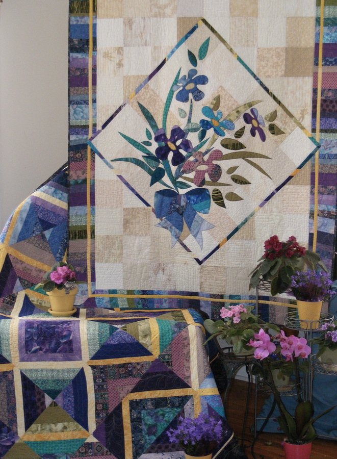 LCCampbell Purple Pride and Purple Posies - These two quilts are sisters. Appliques, and borders for Purple Posies were cut from leftover strips sets from Purple Pride. These quilts will be patterned in my new book, "Innovations and Renovations: String Quilts" to be released this coming fall by Good Books, Inc.