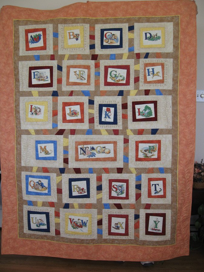 | Design Source - Description | Purchased ABC Panel and cut into blocks. Each block different size, therefore, whacky setting required. This quilt is made for neice, Kaitlin. |