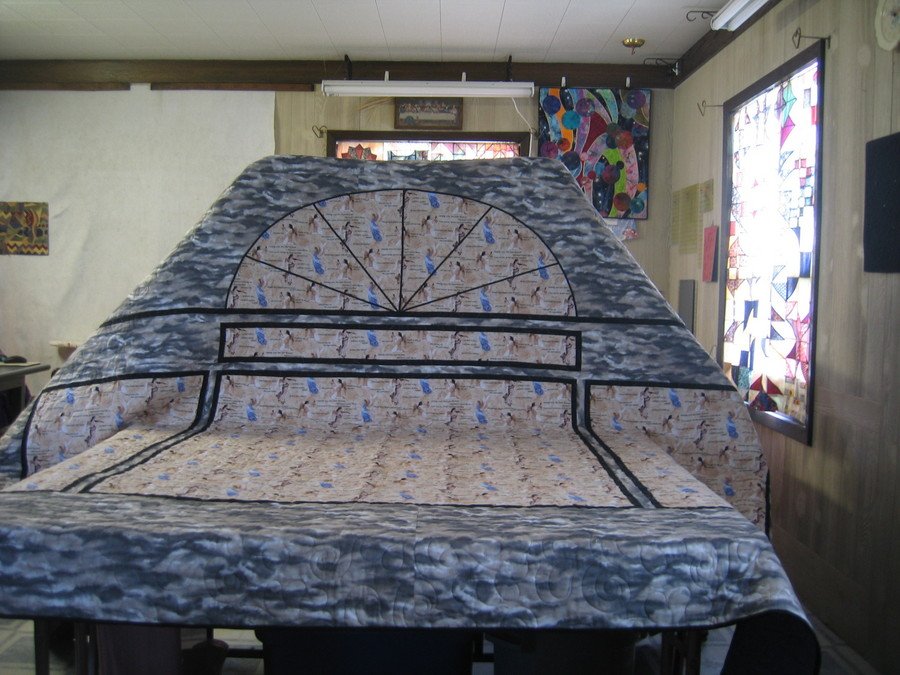 anilee Heavenly Angels - The story goes: a customer brought me 2 1/4 yds. of the angel fabric and asked me to make a King Size (104" X 104") quilt for her son for Christmas. She also did not want the angel fabric cut up too much. She wanted it showcased. I struggled and struggled with how to create such a large quilt with so little fabric. Then I found the fabric that made me think of clouds and started designing. I finally came up with the large stained glass window you see here. I quilted it with a feather design that looked like angel wings.