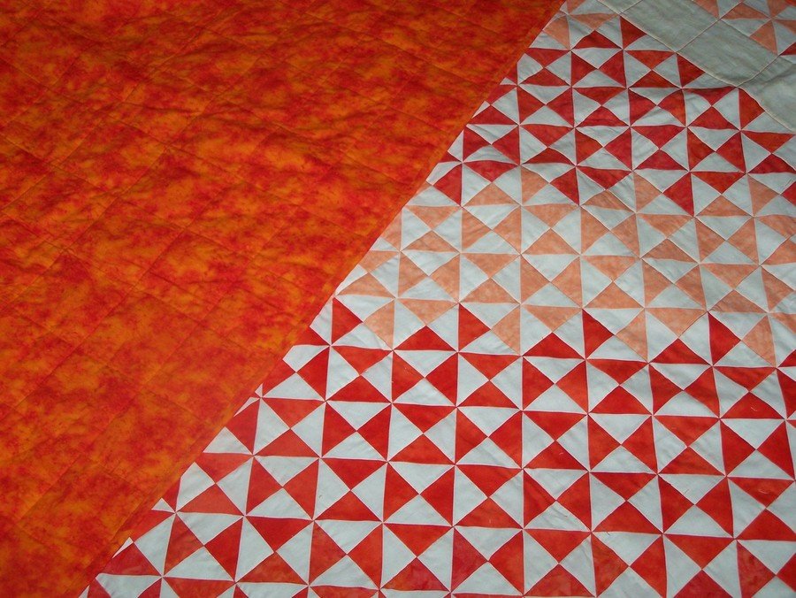 Janetvoice Deamsickle - An orange quilt in summer camp "tribe" colors. Picture shows the front which is the pinwheel and the back.