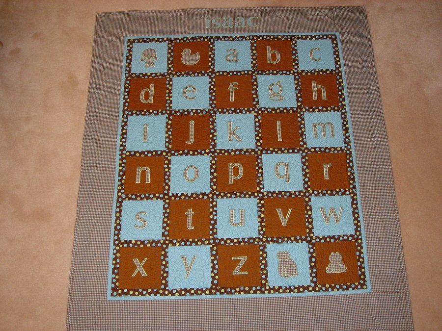 | Design Source - Description | I made this quilt for my new nephew. I digitized an alphabet and some animals from my embroidery software and appliqued onto the blocks. I was very happy with the simple design and color scheme. |