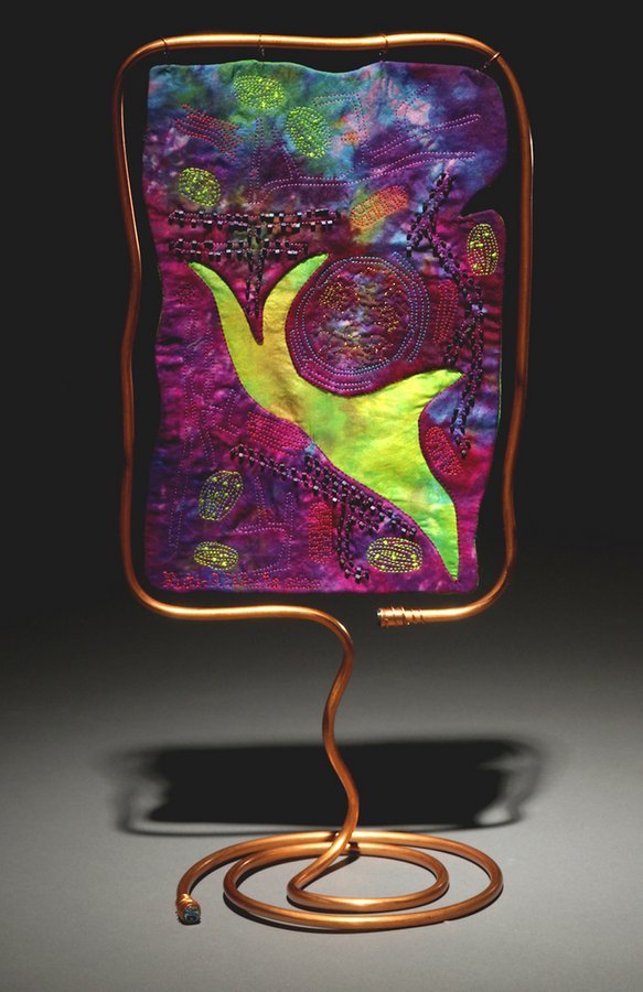 RuthAWhite Phalaenopsis On The Cellular Level - Beginning life as a test for an improvised technique of neo-reverse appliquiltliqué to let the light shine through a single layer of glowing china silk, ‘Phalaenopsis On The Cellular Level’ evolved into a stylized plant cell. It is but a single cell in a multitude that makes up an elegant, silken blossom. Can you identify the chloroplasts, rough endoplasmic reticulum, and golgi bodies? Photography by Andrew Gillis of Cascadilla Photography, Ithaca, NY