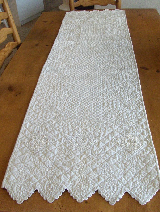 ecmiller Linen Trousseau - This linen table runner was presented to my Aunt as part of her wedding trousseau in September of 1945, by her mother. The linen was created from the flax grown on my Grandmother's farm in Calabria, Italy. The runner was then designed, crocheted and embroidered by my Grandmother. The linen came to America through Ellis Island, in 1909. In the fall of 2007, my Aunt presented this linen to me. I crocheted and added the three doilies on one end of the runner to compliment my Grandmother's cutwork, then machine quilted the piece. I chose a raw silk for the backing and the binding to match the linen.