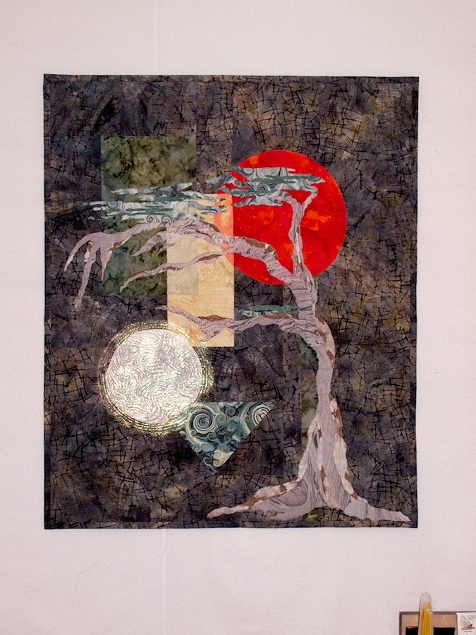 ecmiller Angst in Asilomar - An Original Art Quilt Design by Elaine C. Miller inspired by the Art Glass Designs of Frank Lloyd Wright. Quilt Design completed at Empty Spools Seminar, Asilomar , Pacific Grove, California August-September 2005 Quilt construction includes machine piecing, fusible and machine appliqué, and machine quilting. Embellished with Angelina Fibers.
