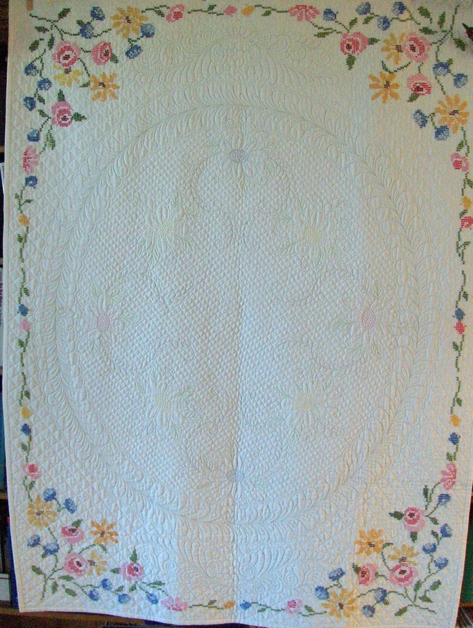 ecmiller Luella's Vintage Linen - A Vintage Linen Tablecloth quilted with Pastel Rainbows, Highlight threads and Bottom Line by Superior Threads. Cross Stitching artist is unknown. I am still in the process of adding pearl beading to the oval feather pattern that surrounds the quilt. I will update the photo when it is finished!