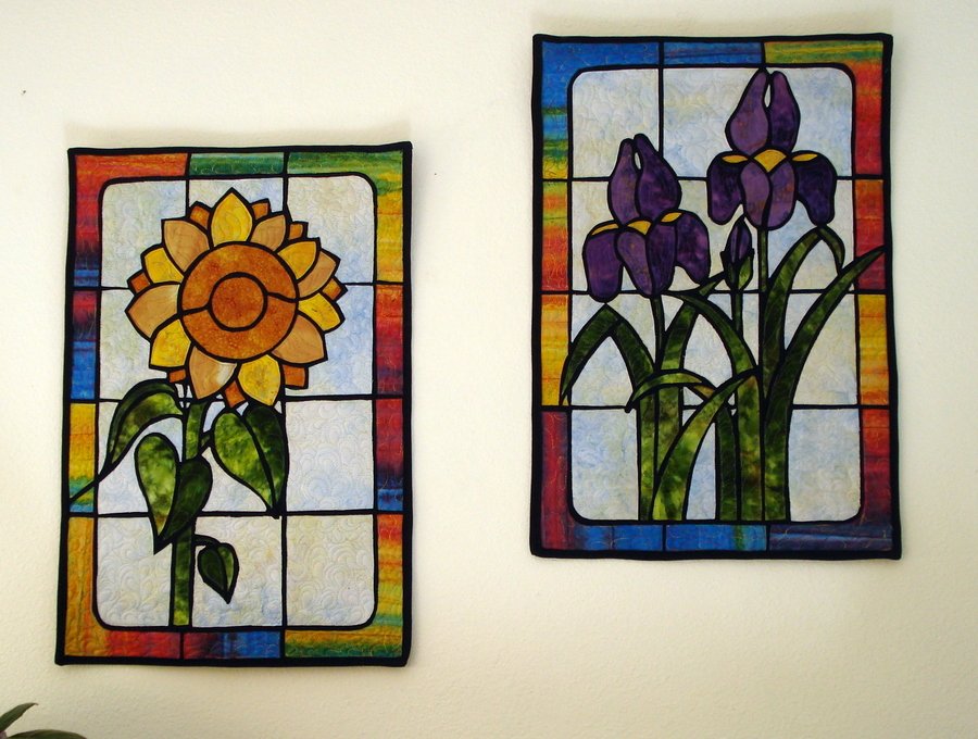 SusieQMcF Stained Glass - These quilts are made using Brenda Henning's approach to stained glass quilts. There are no bias strips for the "leading". This is simply fabric fused onto a black piece of fabric, leaving some of the black exposed to be the leading. Fun and easy project. Quilted with variegated threads to match the "glass". I used Superior Threads "Rainbows" in several shades.