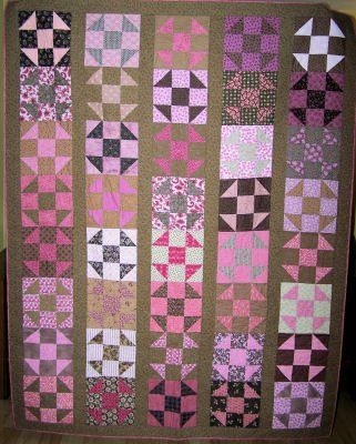 Lauraquilt Chocolate Bubblegum - Six ladies and myself each made 42 blocks and exchanged them with each other. This is my result. The blocks were machine quilted by The Blue Moose Shop in Fulton, NY and I added quilting in the sashing and borders.