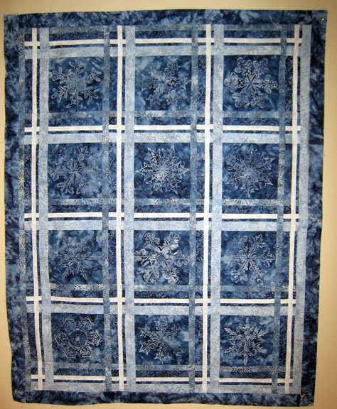 Rhodylady Snowflake Quilt - It's snowing so much here in western Washington I thought this might appease the snow gods! The top only is finished, it is not quilted yet. I'm thinking baby blue metallic thread? I saw the original quilt done in lighter blues at Ruby Street Quiltworks in Tumwater, WA.