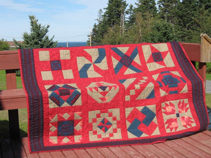 seaglassStitcher sampler - Although this is a traditional sampler quilt, I introduced some of the Jinny Beyer border fabrics to make the squares in the middle of some of the blocks and used that fabric as a border as well. That was the first time I used Jinny's technique to creating interesting mirror image squares from border fabrics. Since then, I have been hooked on her fabrics.