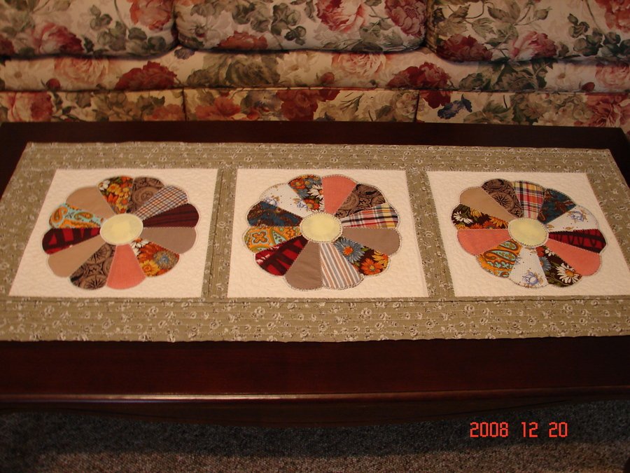 mimi62 Table Runner - The Dresden Plate was pieced by my Grandmother or my Aunt. They are hand pieced. There were nine blocks. I have made one table runner and plan on making table runners for my two sisters.
