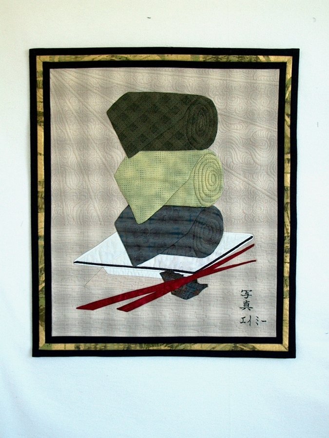 ecmiller California Sushi Rolls - I made this quilt for my niece in celebration of her graduation from Seattle Community College with her degree in Photography. The quilt is an interpretation of a product shot of men's neckties, she made for a popular Department store in Seattle, during her course of study. (You can see a copy of the original photo on the quilt label in my personal photos.) I used Daiwabo fabrics to compliment the theme. The Japanese script in the right corner reads "Photography by Amy". She now works for that store full time and runs her own successful freelance photography business too. Way to go Amy!