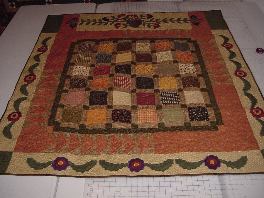 pamsquilting Autumn Colors - I used Moda charm squares and put in sashing and corner blocks with some flying geese blocks in the border. Applique adapted from a pattern by Kim Dahl.