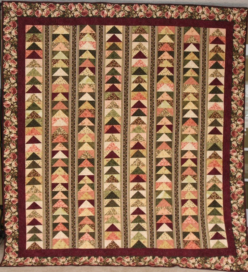 GuysQuilt2 Geese in the Garden - Made for my partner's grandmother who, after a health scare, moved in with her daughter from the house where she had spent most of her life. Though it was her choice, I'm sure it had to be difficult so I wanted to make her a sort of "room warming" gift. It turned into a Christmas gift, though, as I didn't get it finished until recently! The pattern was made to go with a Maywood border print which is cut apart and used for both the outer border and sashing between the strips of geese.