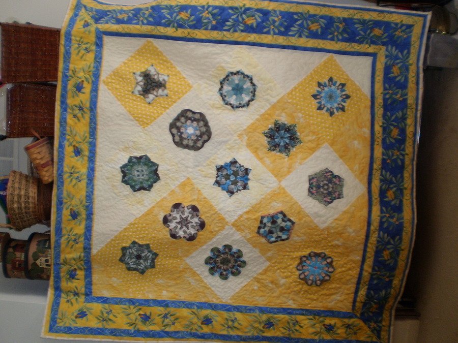 | Design Source - Description | The French Provencial color scheme and various yellow setting squares of Alex' quilt inspired the layout of this quilt for my friend Ardith. The pictures are her family as Kaleidoscopes. |
