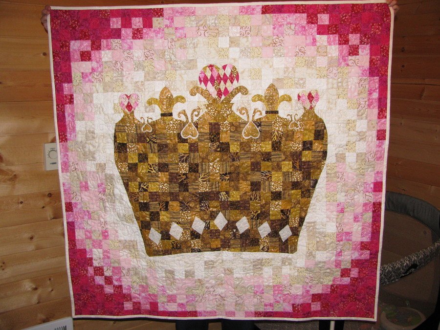 Goshengardens Royal Baby - Baby quilt inspired by a crown photograph. 2" squares of random fabric designed on a wall of felt, then stitched beginning at the base of crown and going up and out from there. Diamonds and top of crown were added using fusible bonding/applique. Machine pieced and quilted on my trusty 1976 Kenmore using meandering design.
