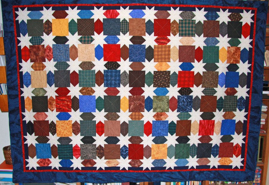| Design Source - Description | Advice for college quilted into border - "respect, faith, diligence, chastity, etc." :) Fabrics pulled from stash by son, stars formed in inner border between 6" squares. |