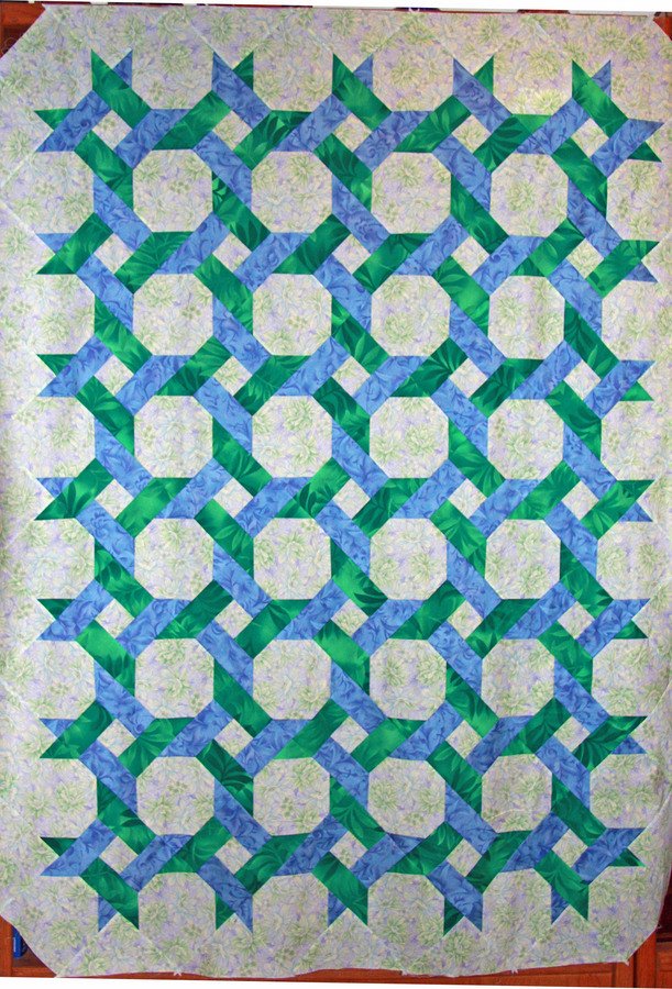 | Design Source - Description | This was an assignment in Rita's quilt class. I began with a floral background and pulled 2 colors for the lattice. Time to quilt this UFO! |