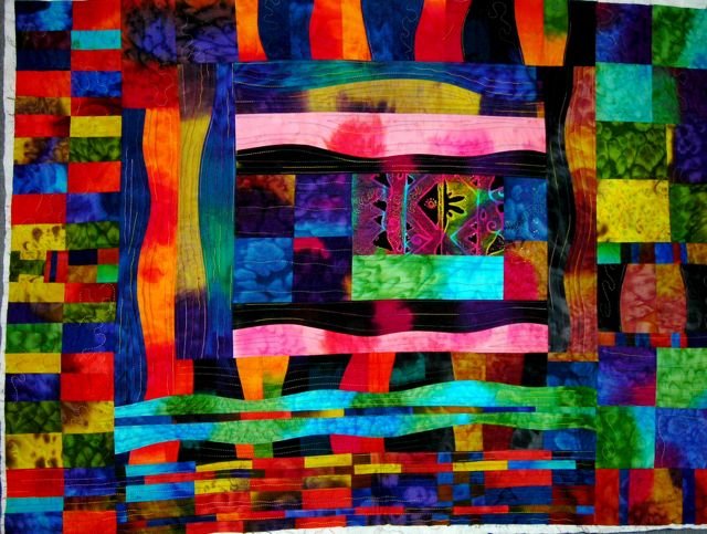 QuiltDove body of water - This is an improvised pieced quilt constructed using hand dyed batiks I bought in a scrap bundle from Bold Over Batiks in 1992, I _think_. I found it again recently during a renovation of our downstairs at home. It is still unfinished but I am sharing it here in case it sinks below the surface of my attention again. (grin) I am really enjoying working with these intense colors!