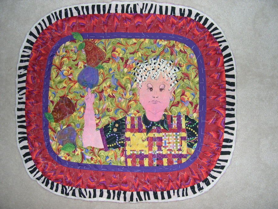 patriciaarndt balancing act - a quilt guild challenge of a self portrait. I was having a very bad year and it wasn't getting any better!! My trying to "balance" was falling short. The challenge was to use their very unusual fabrics with at least 2 inches showing together.