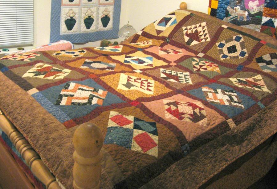patricia3 In Olden Days - This is a BOM quilt of old style blocks that came with paper templates. I converted them to more modern measurements for accurancy and ease in making the blocks. Quilting consists of an undulating feathered border and large feathered circles centered on each of the 20 blocks. The quilt was made for donation to InterFaith Quilters of Longmont , CO for their annual sale to raise money for local charities.