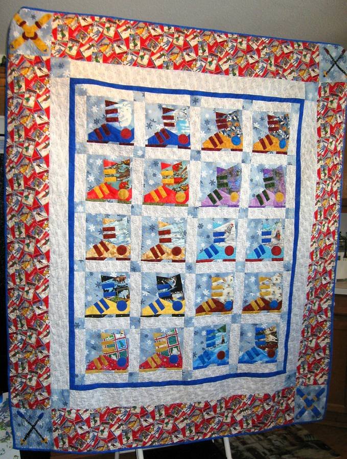 patricia3 These Boots are Made for Skiing - This quilt was made as a gift for a young woman who is studying to be a ski coach. It will be given to her sometime in 2009. She is an Alaskan so many of the boots sport Alaskan themes. The boots are all paperpieced with was a surprise for the maker who thought she was purchasing an applique pattern. The original pattern has 20 different boots but I thought boots should be in pairs so made 2 of each. As always, only cotton fabrics, batting and threads are used in my quilts. It was a very fun quilt to make. The hardest thing was finding the ski themed fabric for the red border and there is also a section of backing done in a blue ski themed fabric.