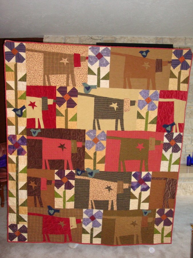 stephiepeterson Crazy as a Bird Dog - I love this quilt. It was so much fun to do. The back is a soft velour/minky type fabric that is so soft to cuddle under. We keep this quilt on our couch and use it to keep warm while watching TV. My husband says it's his favorite quilt I've made. He likes the design, plus the softness of the back. I hand embroidered the names of "all the dogs I've loved before" on each dog on the quilt. We had a Chesapeake Bay Retriever named Chance, and one of the dogs on the quilt is named chance. When my husband would sing, "He's a good old hound dog to me...", Chance would howl and sing along with him. So, Kathy quilted, "He's a good old hound dog to me..." and a musical staff/notes on that block. This quilt has a lot of sentimental value to me because it makes me think of many of the best dogs I've had who have now passed on. It's a nice way to remember them.