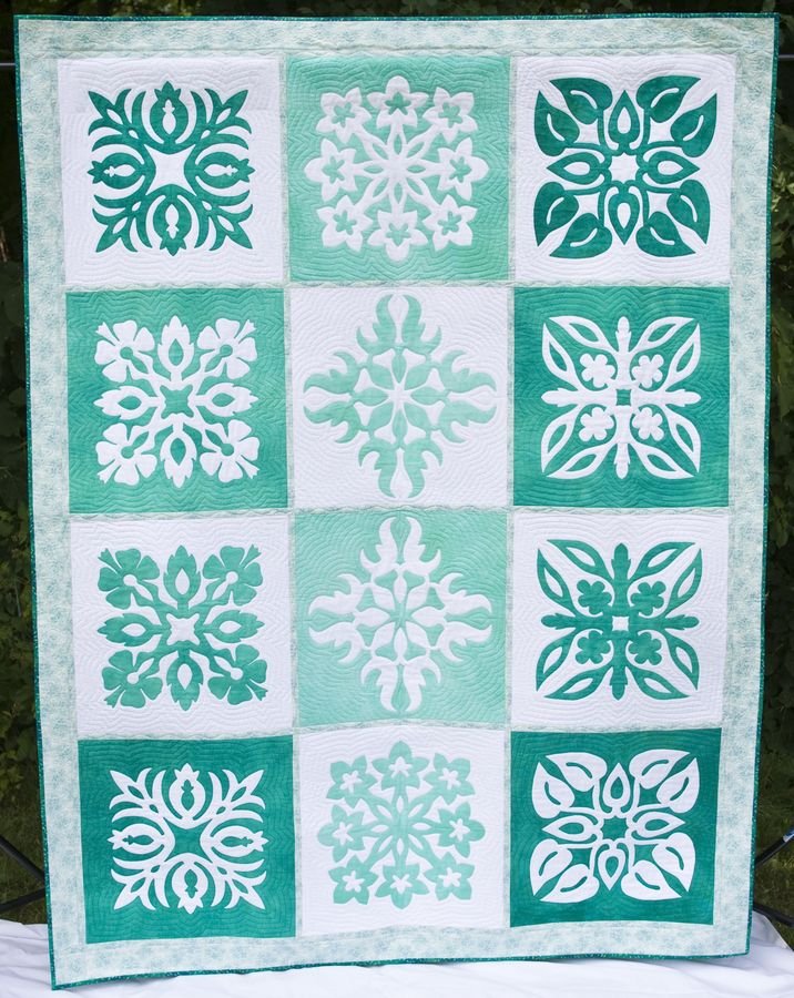 umknepp Malu Lani - This quilt celebrates 40 years of friendship between Laurie and me. Laurie lived for many years in Hawaii. Malu Lani means "protected by heaven" and was made to warm her as she continues to successfully battle cancer. I used Stacy Michell's technique for the applique and blanket stitching, echo quilted each block, and then assembled the quilt. Postscript: my dear friend died in January 2010; still protected by heaven.