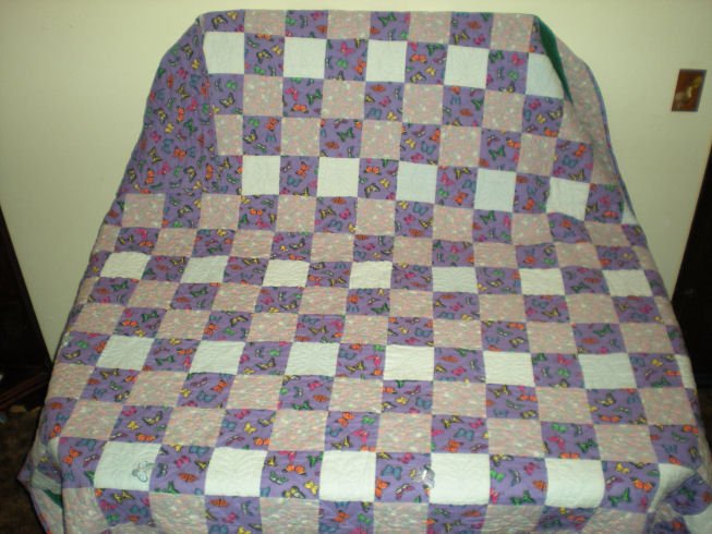 Cris1 Butterflies in the Patch - It's hand quilted without a hoop, hand applied commercial appliques and machine pieced, . The reason why there is butterflies is because I love butterflies. There are hearts quilted around the border. I started the quilt in 1994, life got in the way, but it was finally, finished in 2006.