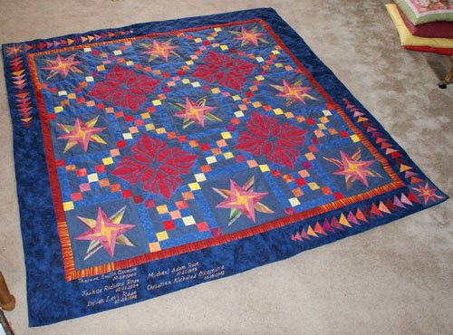 ocdquilt Stars over California - Stars & blocks of red, orange, and gold on a dark blue background. Modification of pattern published in Peggy Martin's Quick Strip Paper Piecing Book. This is a modification of her Rainbow Galaxy quilt shown in the book.