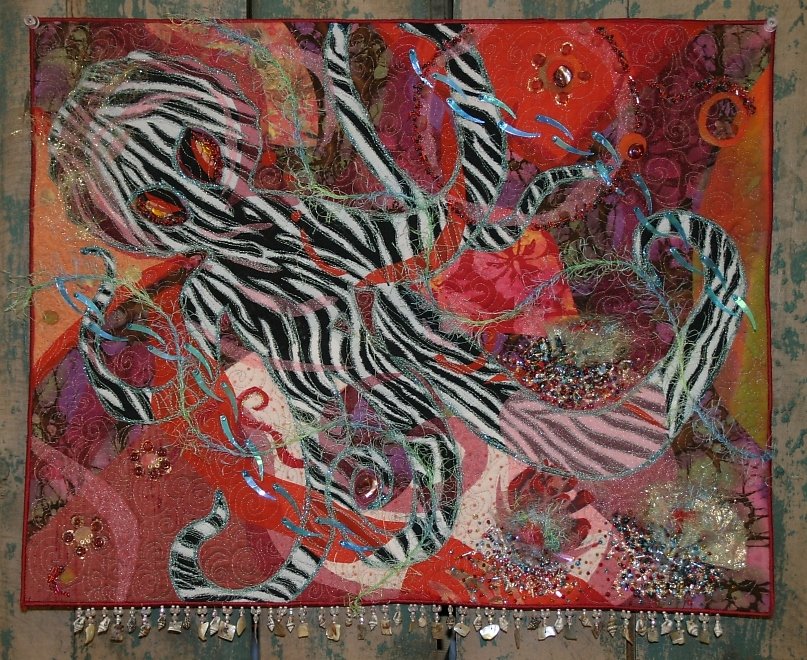 brenn1 Octopus' Garden - An art quilt I started at Quilting Adventures in Texas, 2008. I took a fusing class from Sue Benner. This puppy is fused and layered and beaded and all kinds of wild stuff. I took my image inspirations from a picture book called "Reefs".