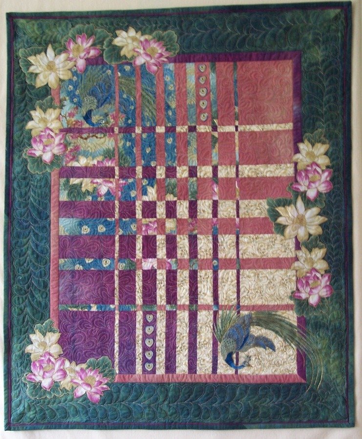 elsielf Peacocks in Paradise - I added appliques cut out from the fabric to Ricky's Harmonic Convergence pattern for this 2008 Hoffman Challenge entry.