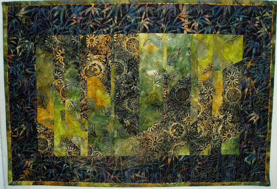 lizzyanne convergence in the jungle - number 4 made with commercial batiks. I loved the forest feel to this one and an elephant "appeared" on the right as if coming from behind trees. Other people have seen other creatures in it too. I enhanced the "trunk" and "eyes" with tiny gold beads and will probably add more beads. I used Ricky's method of very fine piping before the binding.