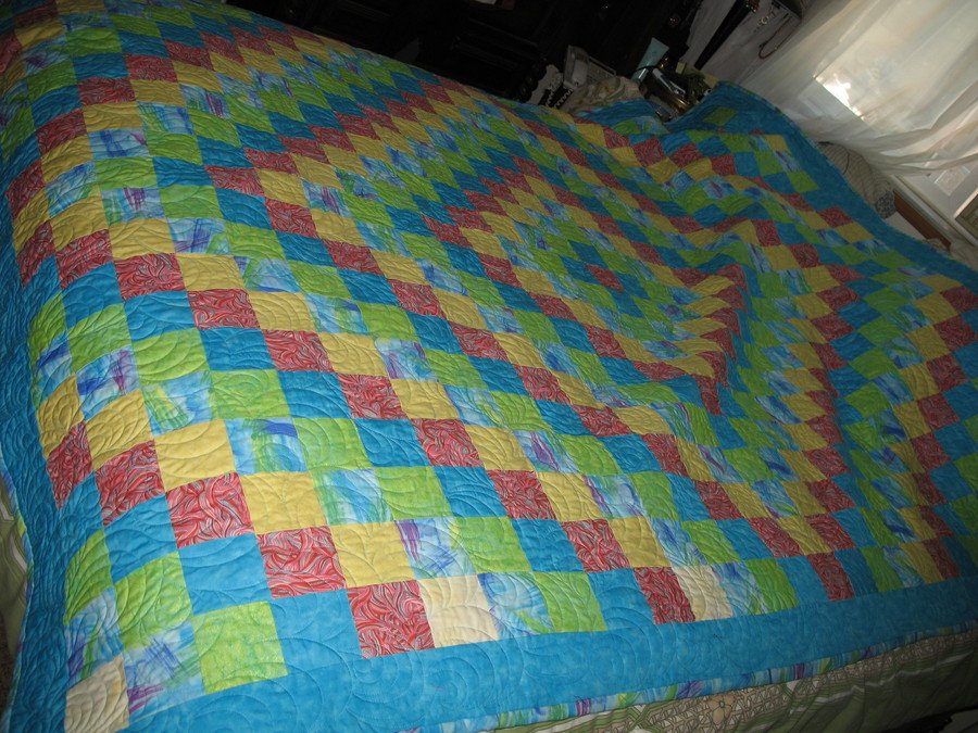 | Design Source - Description | Strip pieced. Went together quickly. Technique taught by a friend, Jessyca Cochran, in a class at church. Quilter was Kathy Allen, Napa, CA, and she did a beautiful job quilting it. Size approximate. |