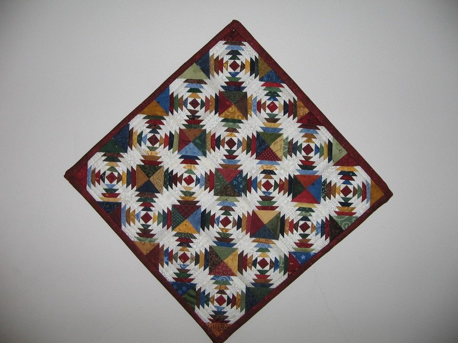 barbtaz Miniature Pineapple - This quilt measures 12" X 12". Sixteen blocks contain a total of 720 pieces. It was pieced at a weekend retreat organized by a local quilt shop. By the end of the retreat I was "begging" my fellow quilters for their scraps to add extra variety. I'm very happy with how it turned out.