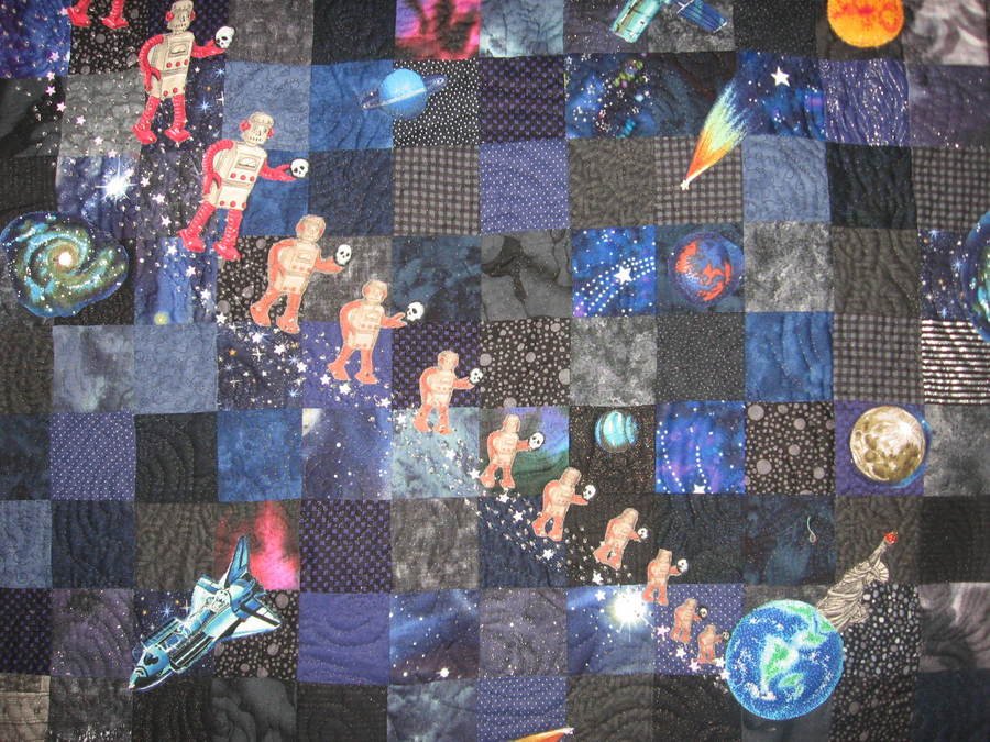 | Design Source - Description | A challenge quilt where the robots fabric (in one size) was the challenge. I resized them to look like they were approaching Earth bearing their gifts. |