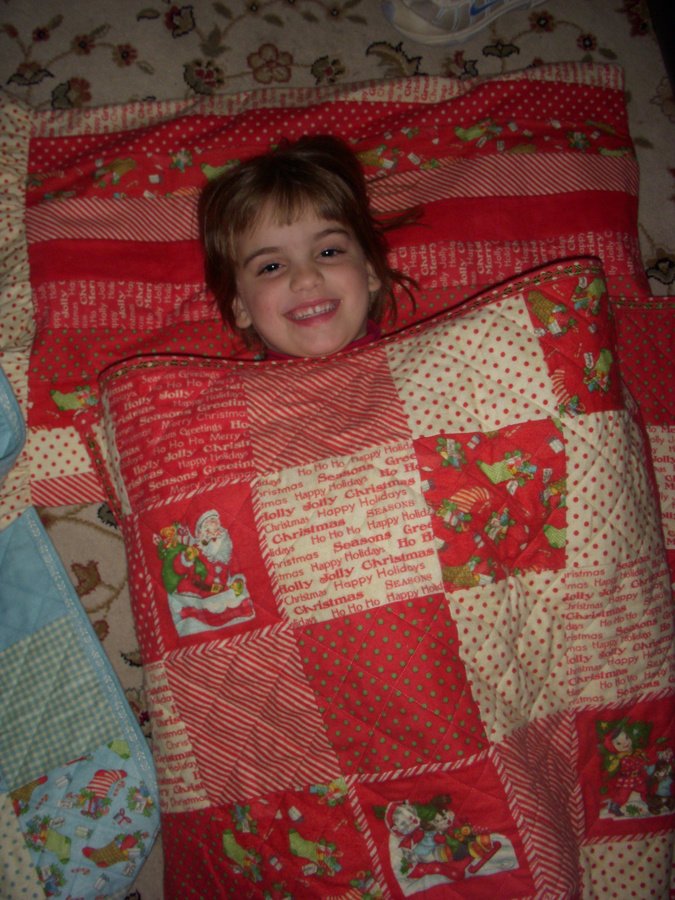 k2designs Red Christmas 08 - A fun, flannel quilt for dreaming about sugar plums with a matching 'jelly roll' pillow case.