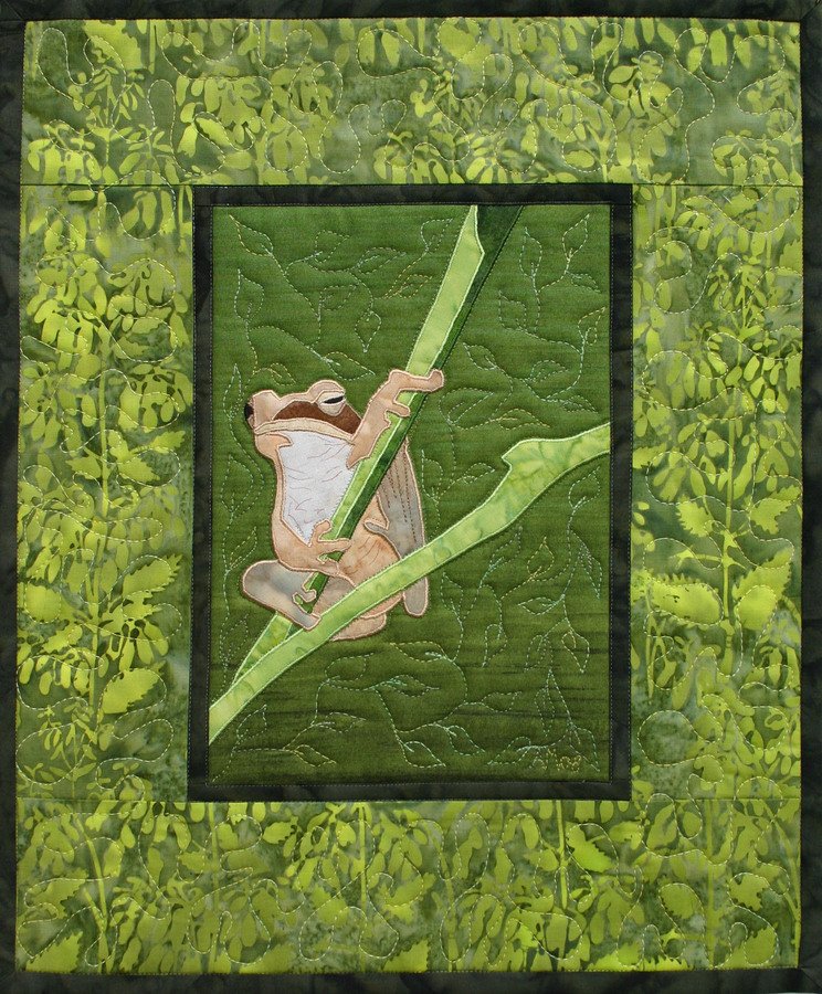 AnneM Tree Frog - This small wall hanging is of a four lined tree frog which I photographed one day in our garden. The design is constructed using satin stitch machine applique and rayon thread. It is quilted using variegated cotton and invisible thread.