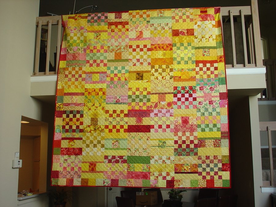 Colorplus Sun Gridlock - My first quilt -- I took a class taught by Jean Wells in Sisters, OR. It was color study class, using Kaffe Fasset's Gridlock pattern. The quilt only as two alternating blocks. One has 36 two-inch squares, and the other had 3 rows - 1 with three 4-inch squares, and 2 with 4x12 strips. My challenge was to not have equal distribution of color. My quilt was to be yellow & red with green. It was hard to keep repeating the yellow.