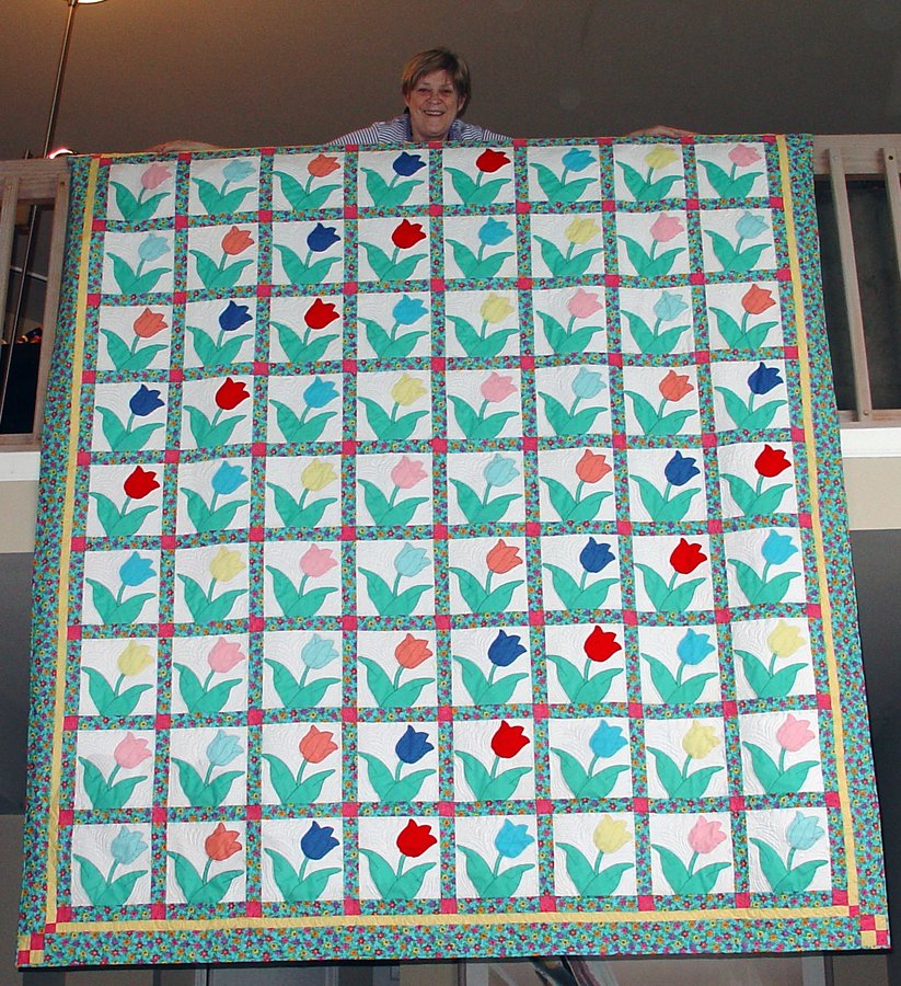 Colorplus Tulip Happy - My friend Judy had appliqued these blocks in the early 50's as a teenager. These tulips were made from floor scraps provided by her aunt worked for Mode-O-Day. I thought it was such a waste to have these beautiful tulips sitting in a box, so I asked if I could take them and create a quilt for her. This was the result. My greatest challenge was to create a layout that successfully dealt with the pastel and bright color tulips. I was fortunate to find a fabric for the sashing that worked with both. The coral posts gave it the punch and structure that it needed.