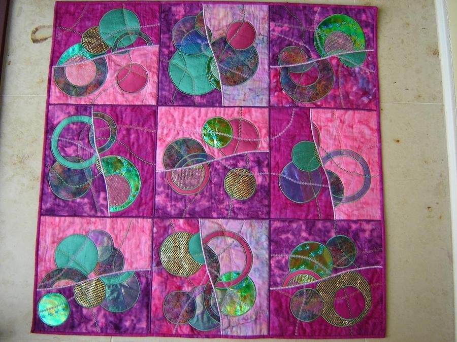 marjolijn Circles - Together with some friends we spent a day quilting. We all used the same method, but all the quilts were different. So much fun to see and do. I made 9 blocks and appliqued circles. After that the block were cut in two parts and all the blocks were shuffled to make new blocks.